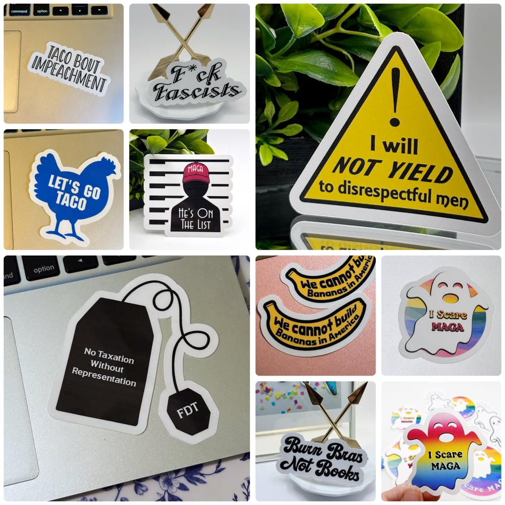 Pick from a selection of political stickers. Each sticker is either 2.5” or 3” at its largest point and made of water resistant vinyl material & clear vinyl laminate
